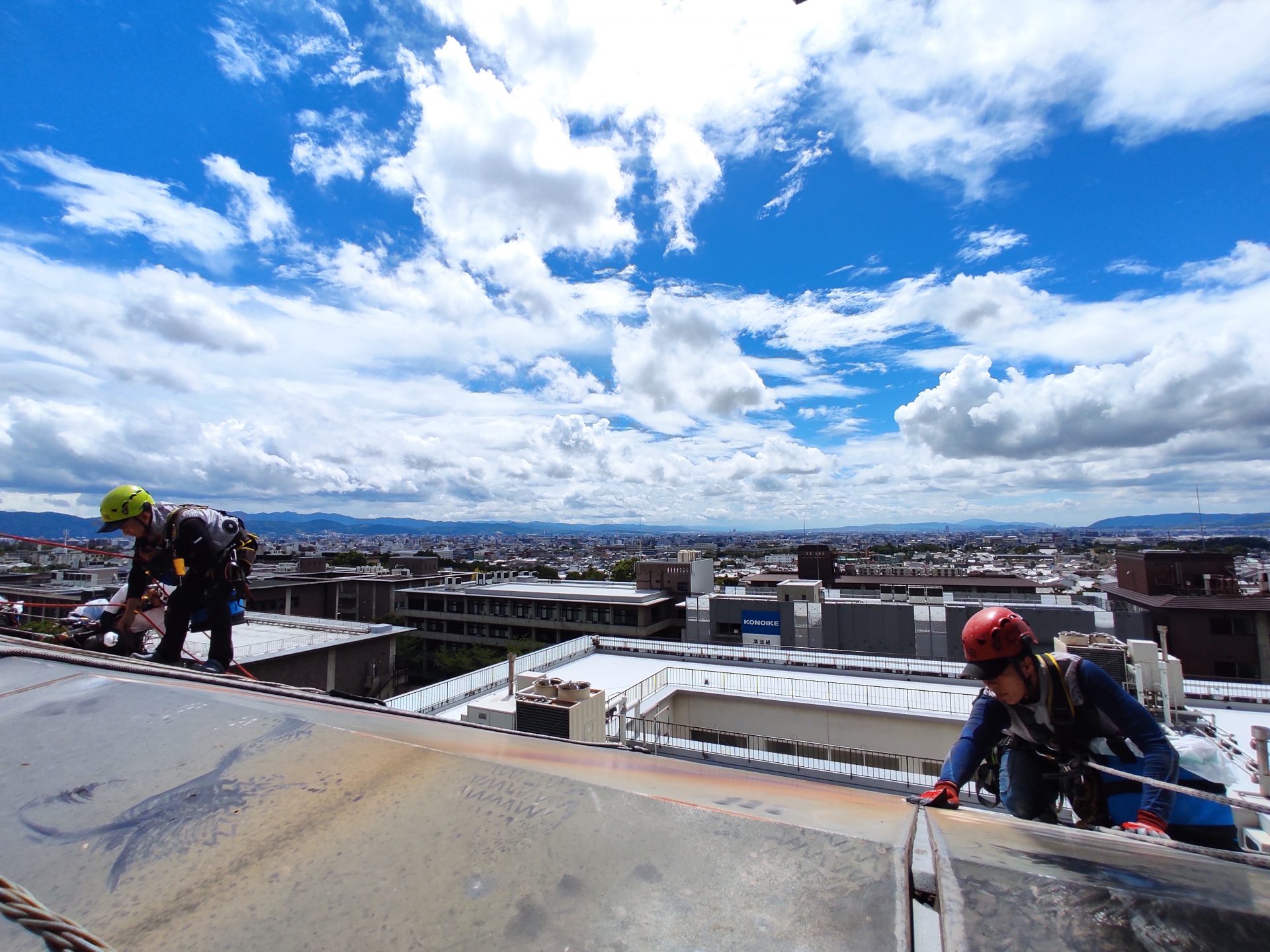 足場を立てず、屋上などからロープを用いて外壁の施工箇所にアクセスする無足場ロープアクセス工法。