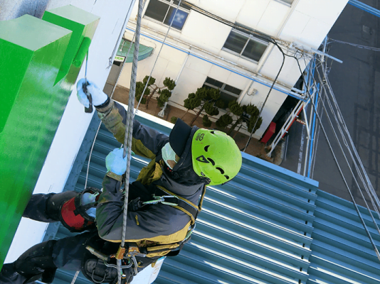 足場を立てず、屋上などからロープを用いて外壁の施工箇所にアクセスする無足場ロープアクセス工法。