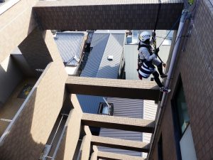 駅前の大規模施設ですので、足場を仮設しようとすれば足場費用や交通誘導員の費用が大きいだけではなく、道路使用許可取得の困難さやお客様への影響など非常に困難かつテナントへの悪影響が避けられない現場でしたが、無足場ロープアクセス工法とシーファイン工法でそのような問題なく施工できました。